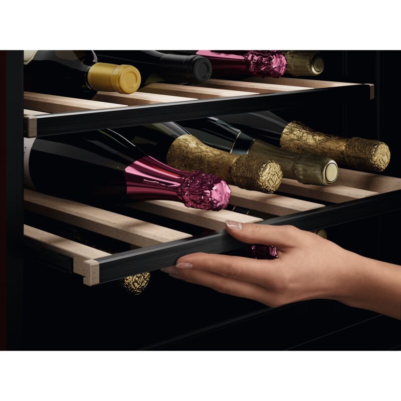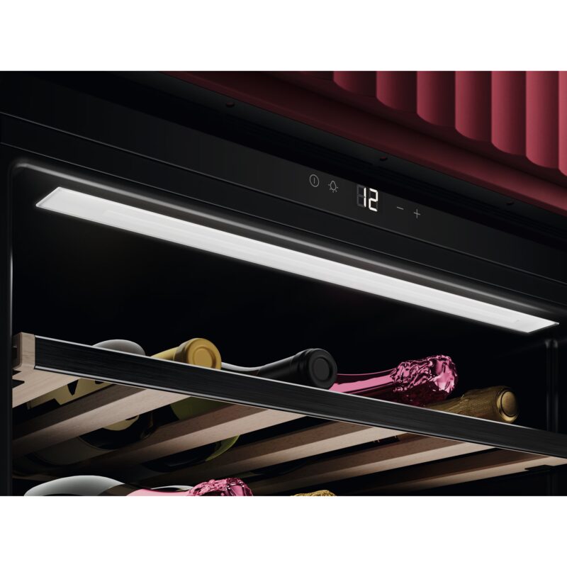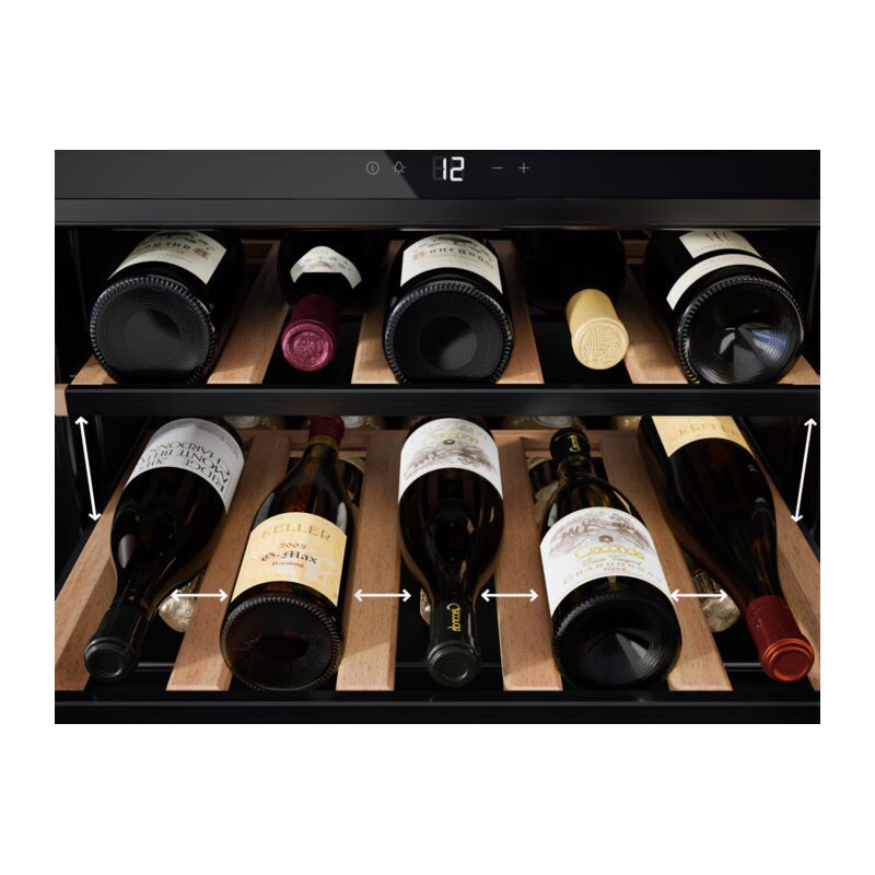 Les clayettes en bois Perfect Shelving sont extensibles et conçues pour accueillir toutes les bouteilles standards de 750 ml, y compris le champagne, sans abîmer les étiquettes. L’éclairage Top LED met en valeur votre collection.