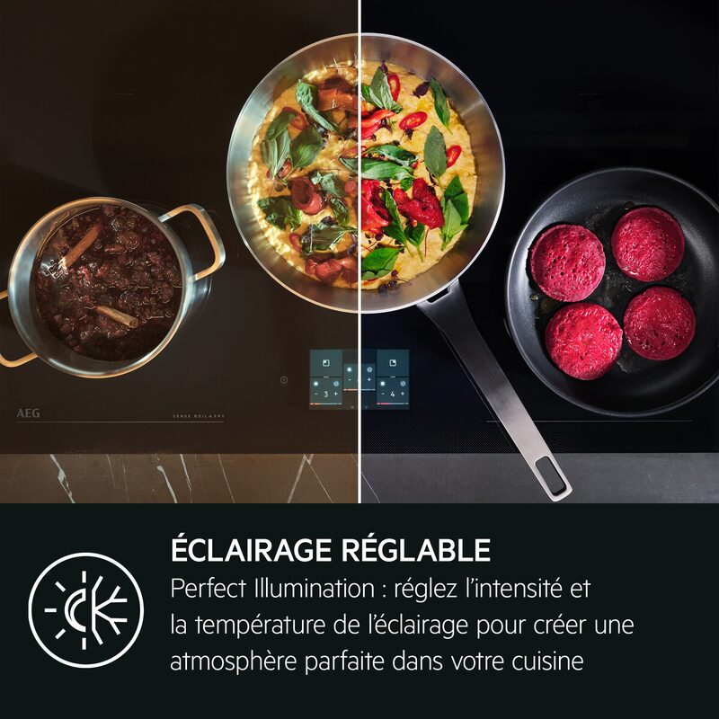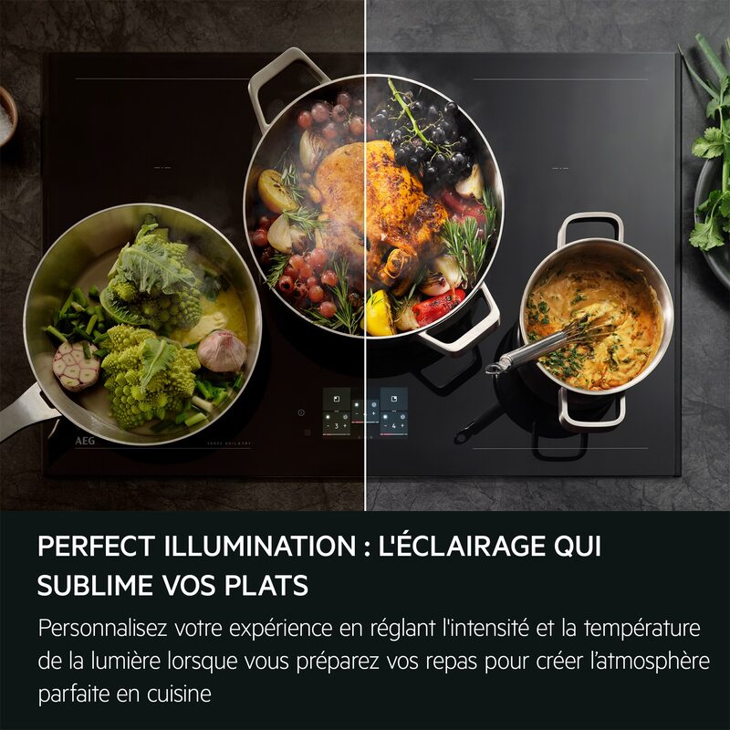 L’éclairage Perfect Illumination restitue fidèlement les couleurs des aliments. La température et l’intensité lumineuses sont ajustables pour créer l’ambiance souhaitée, tout en garantissant une excellente visibilité sur la zone de cuisson.