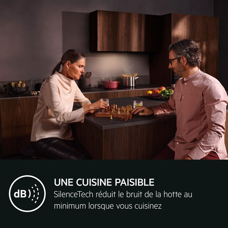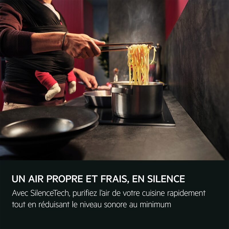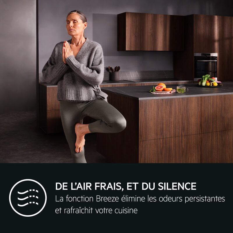 La technologie SilenceTech maintient un niveau sonore réduit tout en assurant une extraction performante. La fonction Breeze permet de rafraîchir l’air après la cuisson en toute discrétion, pour une cuisine agréable même après la préparation des repas.