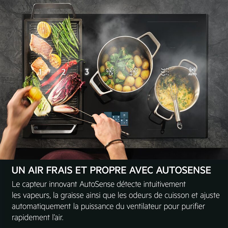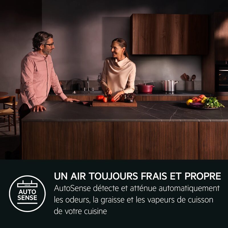 La technologie AutoSense détecte automatiquement les vapeurs, la graisse et les odeurs générées pendant la cuisson. La hotte ajuste alors la puissance d’aspiration en temps réel afin de purifier l’air efficacement, tout en limitant le bruit inutile.