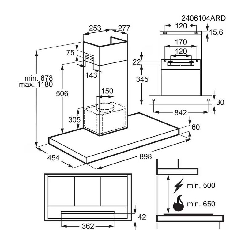 Hauteur minimale d’installation : 50 cm (plaque électrique), 65 cm (plaque gaz)