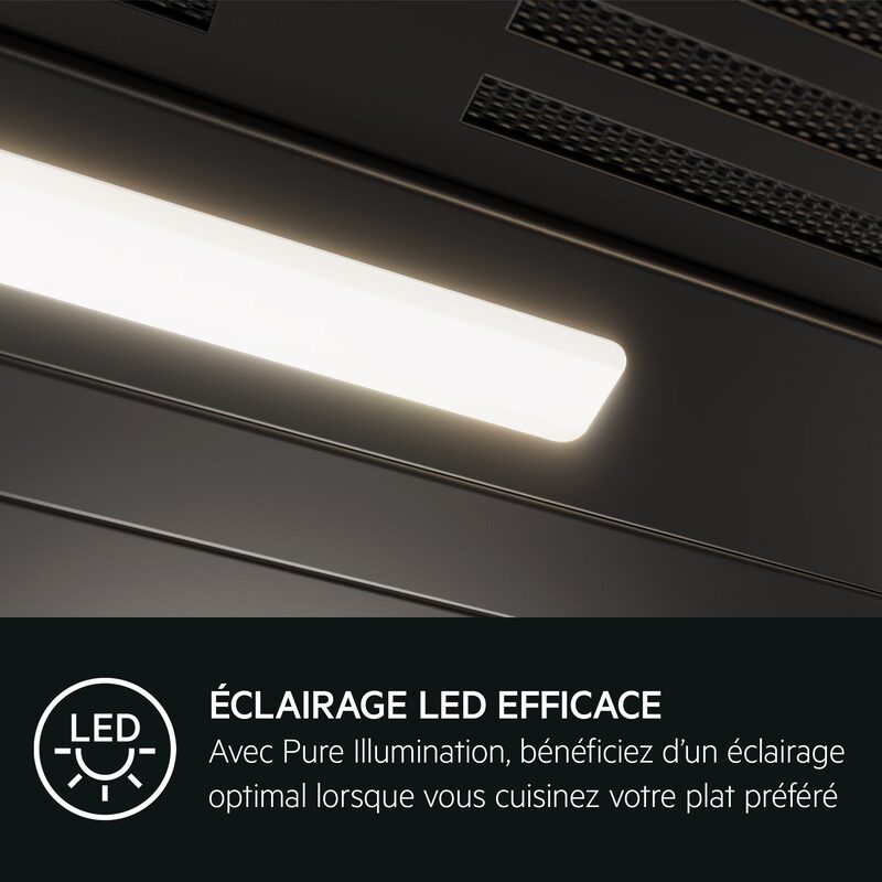 L’éclairage LED Pure Illumination diffuse une lumière homogène sur l’ensemble de la zone de cuisson. Il facilite la visibilité des préparations et améliore le confort visuel lors de l’utilisation quotidienne.