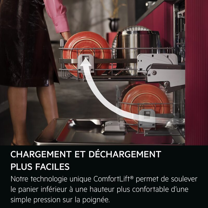 La technologie exclusive ComfortLift® permet de soulever le panier inférieur à hauteur du panier supérieur grâce à une poignée ergonomique. Cette innovation facilite le chargement et le déchargement de la vaisselle en réduisant les efforts.