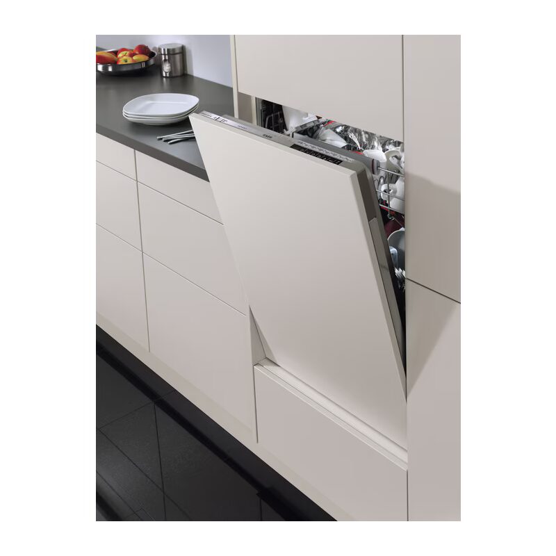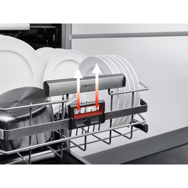 Lave-vaisselle AEG tout intégrable 60 cm – 14 couverts avec technologie ComfortLift® qui remonte le panier inférieur à hauteur pour un chargement facile.