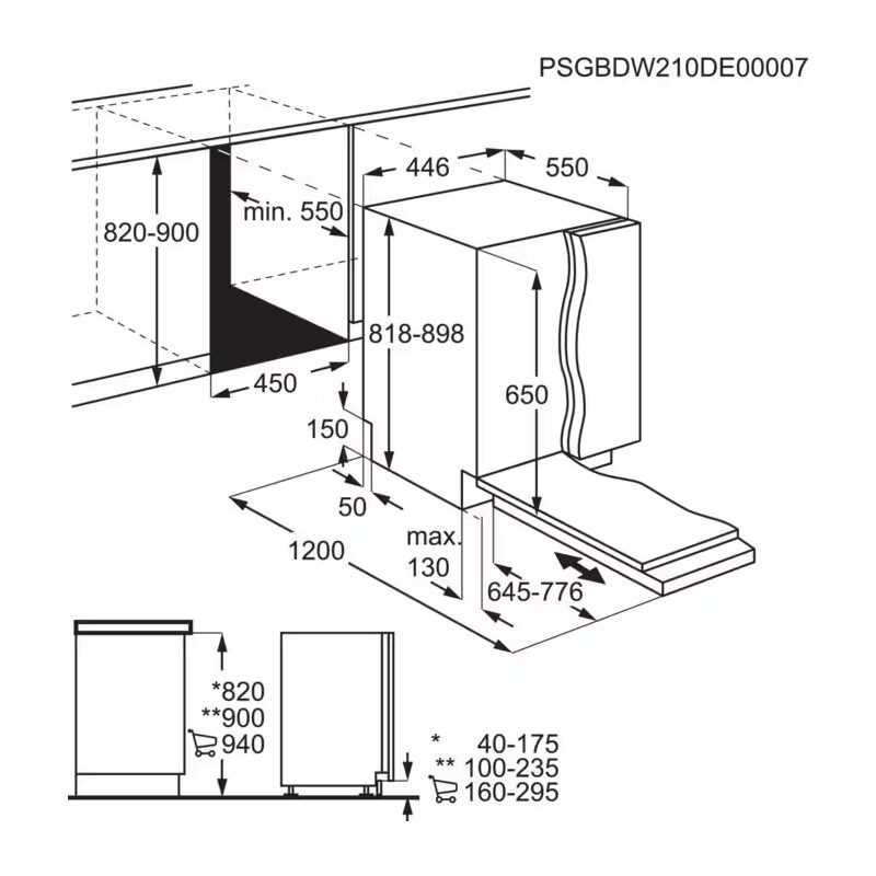 Dimensions d’encastrement : 820 / 900 × 450 × 550 mm