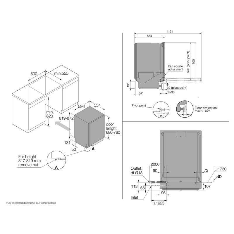 Conçu pour une installation tout intégrable, ce modèle s’adapte parfaitement à votre cuisine. Ses dimensions de 819 x 596 x 554 mm permettent une intégration précise dans une niche standard.