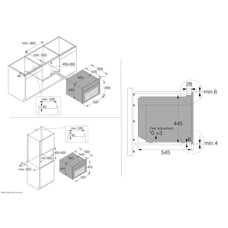 Conçu pour une niche compacte de 450 mm, ce four s’intègre parfaitement en colonne. Ses dimensions sont de 458 x 597 x 564 mm. :contentReference[oaicite:3]{index=3}