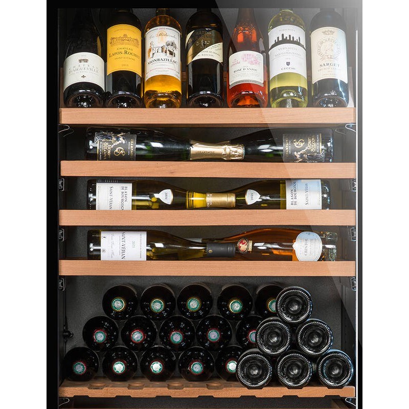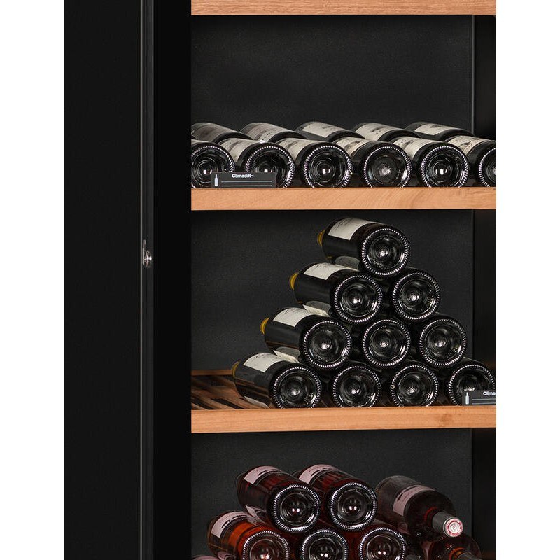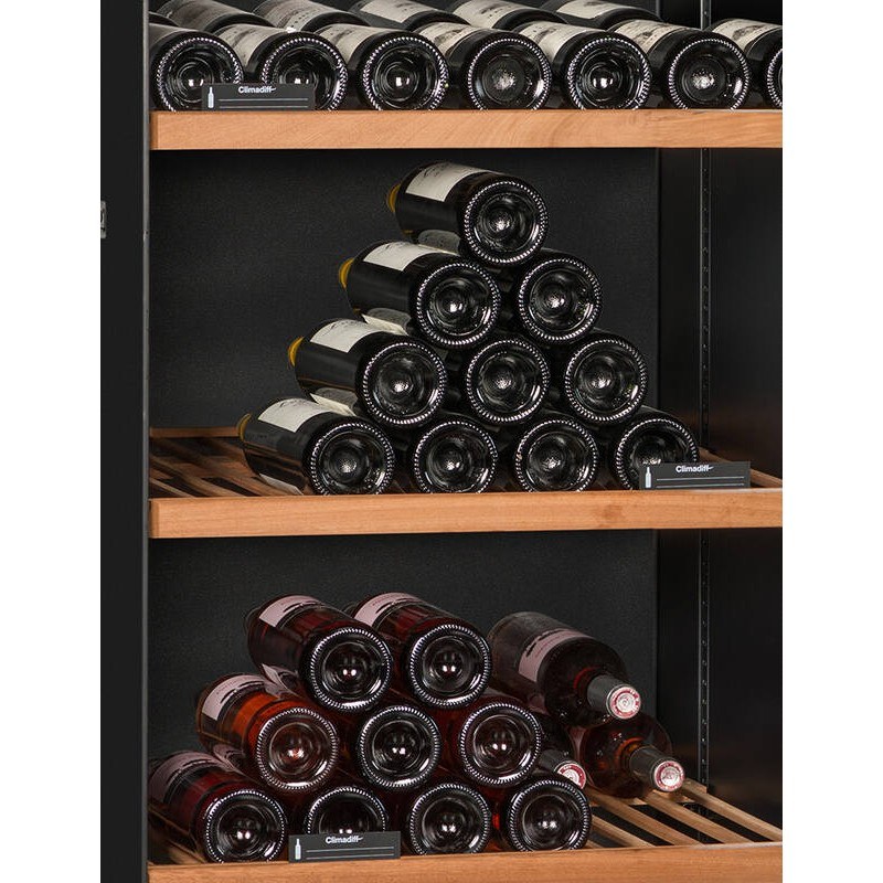 Les clayettes en bois multi-formats permettent d’accueillir différents types de bouteilles et d’optimiser l’organisation intérieure.
