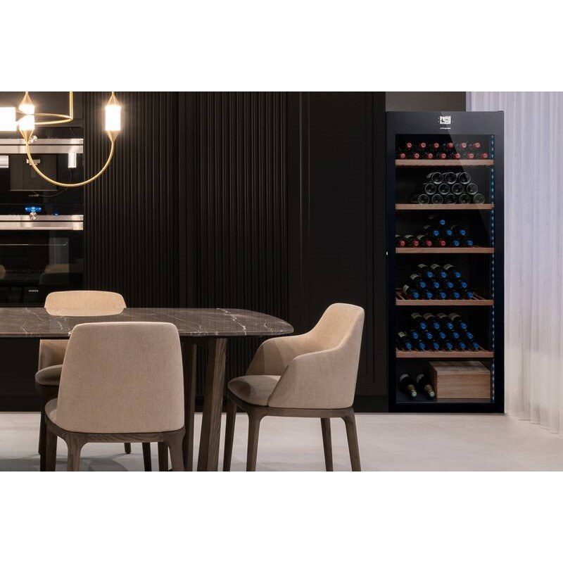 Cave à vin polyvalente avec une capacité de 294 bouteilles, une gestion 3 zones de température et un fonctionnement par compresseur.