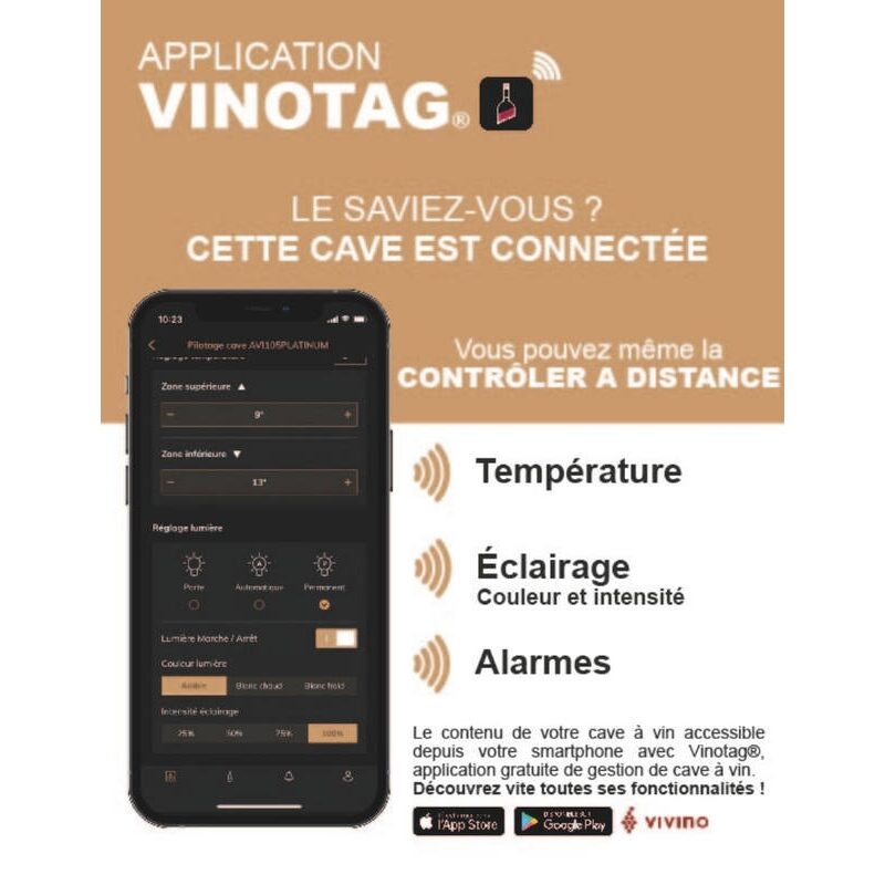 La connectivité Wi-Fi permet de piloter à distance la température, l’éclairage et les alarmes via l’application Vinotag. Cette gestion intelligente offre un contrôle précis et un suivi permanent des conditions de conservation.