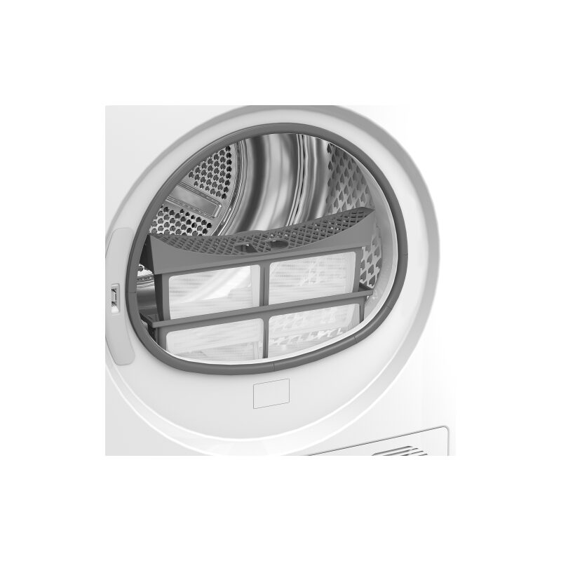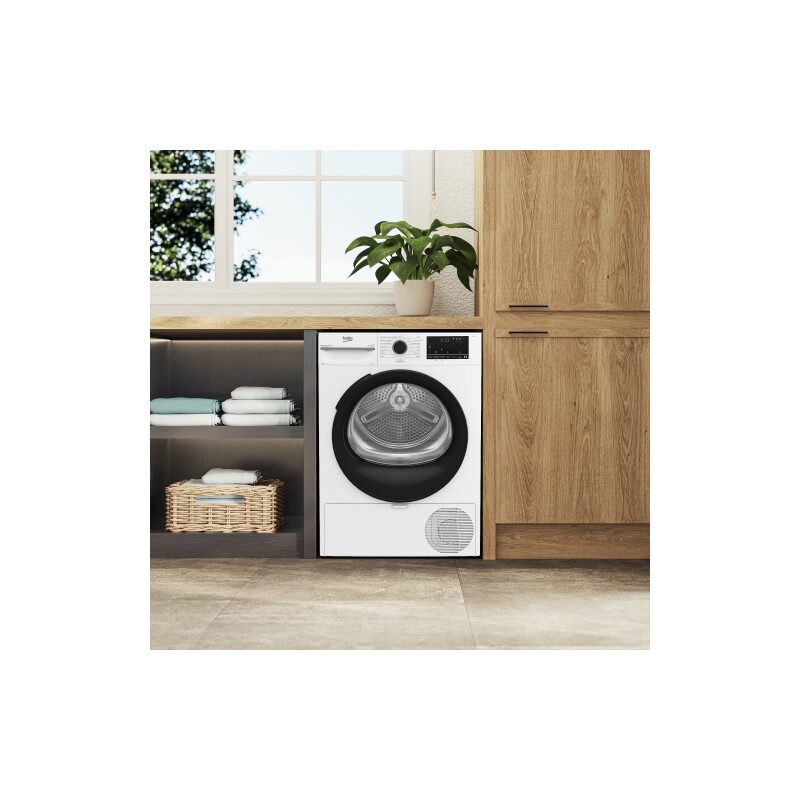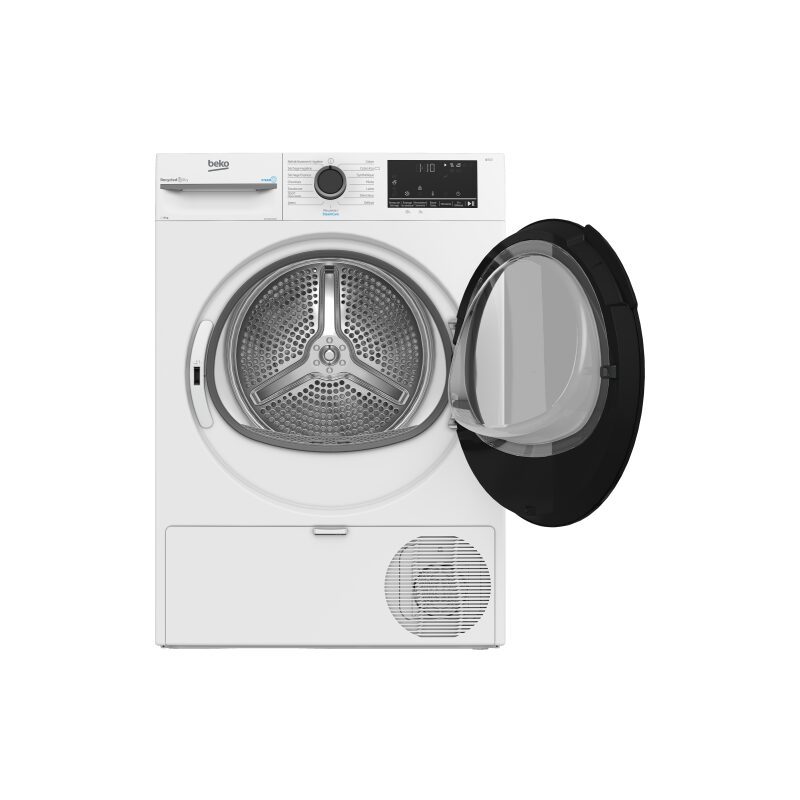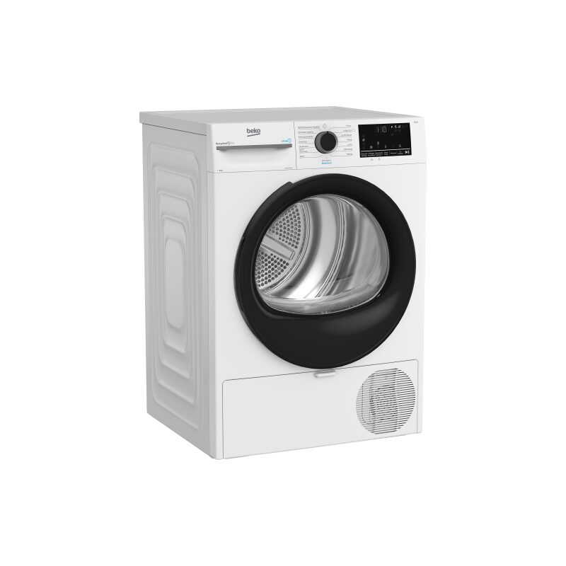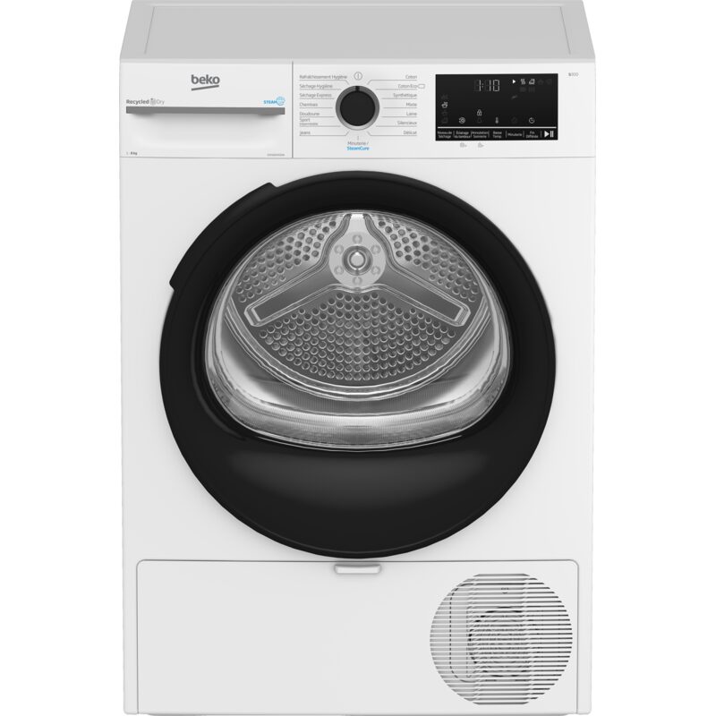 Sèche-linge Beko D5H284930W à pompe à chaleur, capacité 8 kg, séchage par capteur d’humidité, fonction SteamCure vapeur, double filtre à peluches, tambour inox Aquawave, classe énergétique C, conception à base de plastiques recyclés.