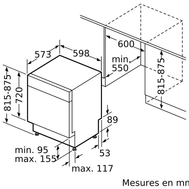 Niche d’encastrement (H × L × P) : 815–875 × 600 × 550 mm