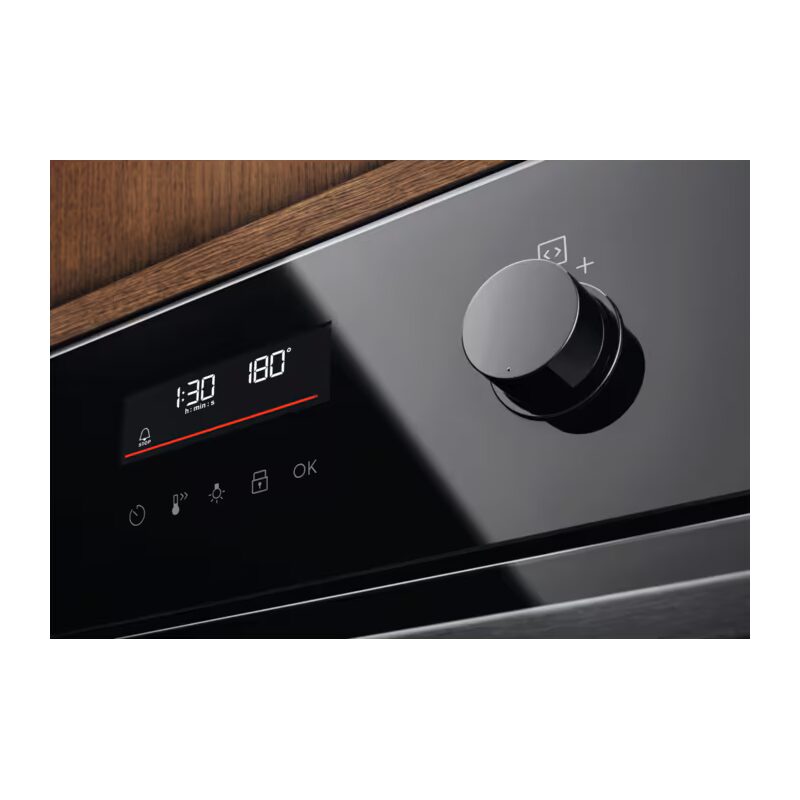 Le four est livré avec une grille et une lèchefrite. Il dispose d’un éclairage intérieur de 40 W pour une visibilité optimale, ainsi que de manettes rétractables push/pull offrant un design épuré et une prise en main confortable.