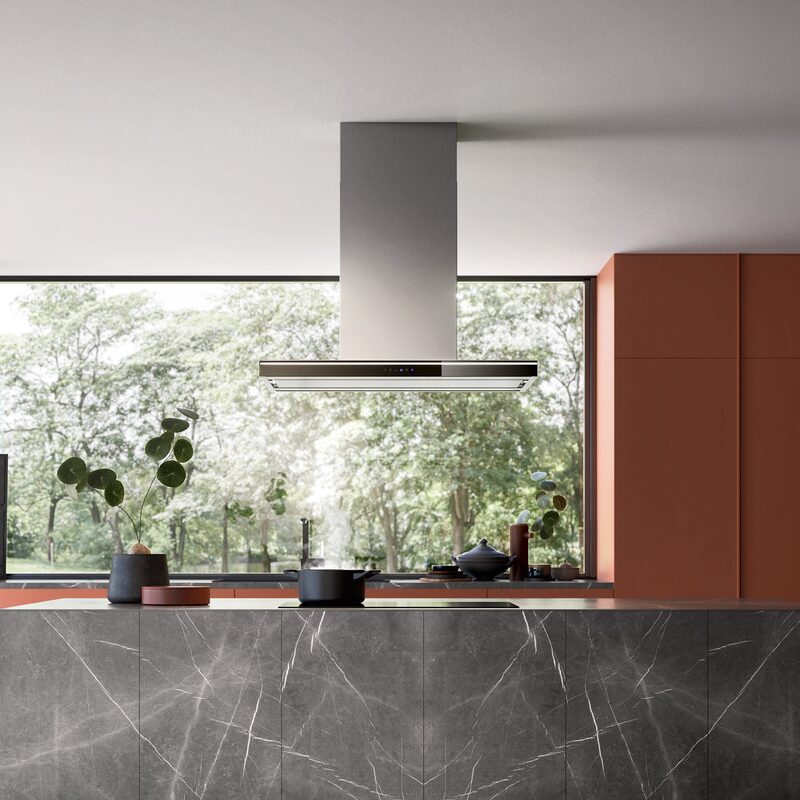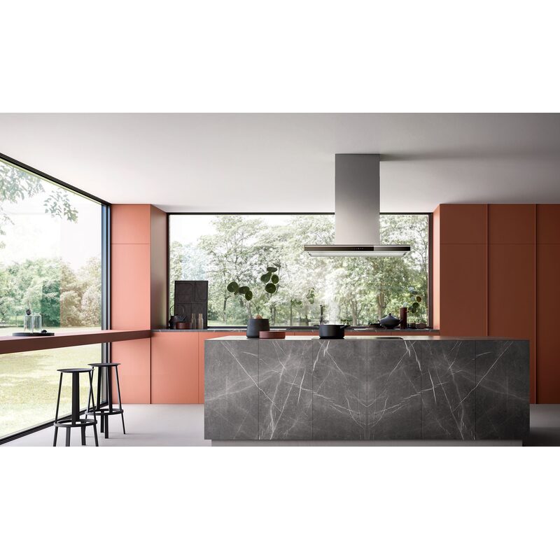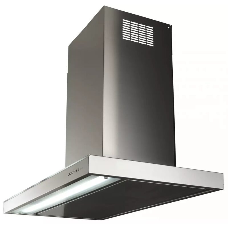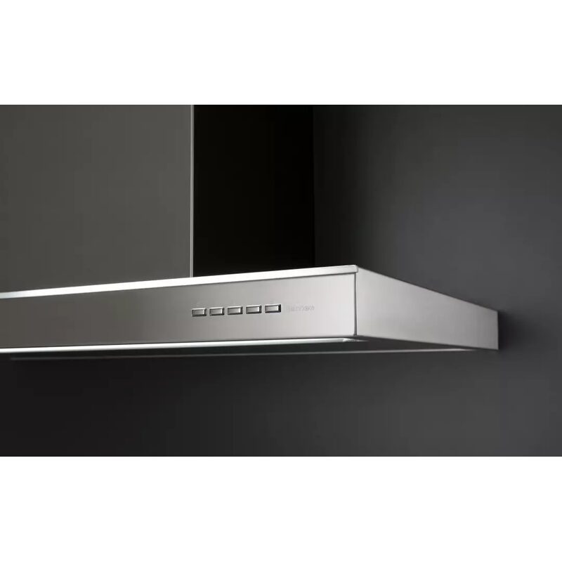 Fabriquée en acier inoxydable brossé AISI 304, la hotte affiche une finition premium et durable. Le bandeau de commande en verre trempé noir apporte une touche contemporaine et facilite le nettoyage.