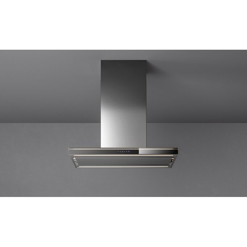 Hotte décorative murale Falmec Lumina NRS® 90 cm en inox AISI 304, aspiration périmétrale, technologie silencieuse NRS®, débit jusqu’à 800 m³/h, 4 vitesses, éclairage néon blanc, commandes sensitives. Fonctionne en évacuation ou recyclage.