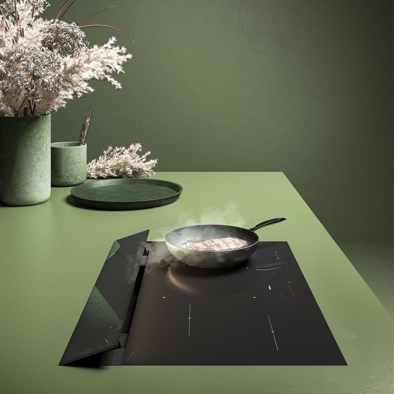 L’aspiration est positionnée au centre de la plaque, avec des volets en verre noir motorisés qui s’ouvrent automatiquement lors de l’activation.