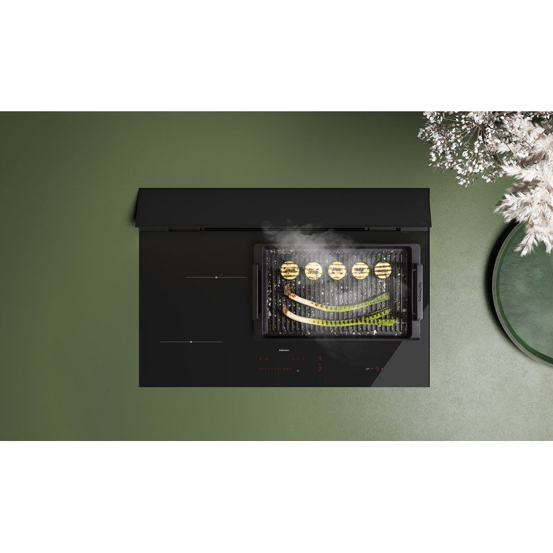 Plaque de cuisson induction aspirante Falmec Brera largeur 75 cm, 4 zones avec technologie Flex Surface, aspiration intégrée 800 m³/h, volets motorisés en verre noir, commandes slider tactiles, 9 puissances + Booster, fonctionnement évacuation ou recyclage, classe énergétique A+++.
