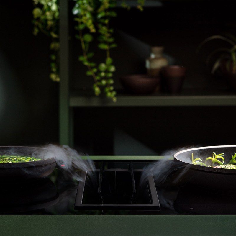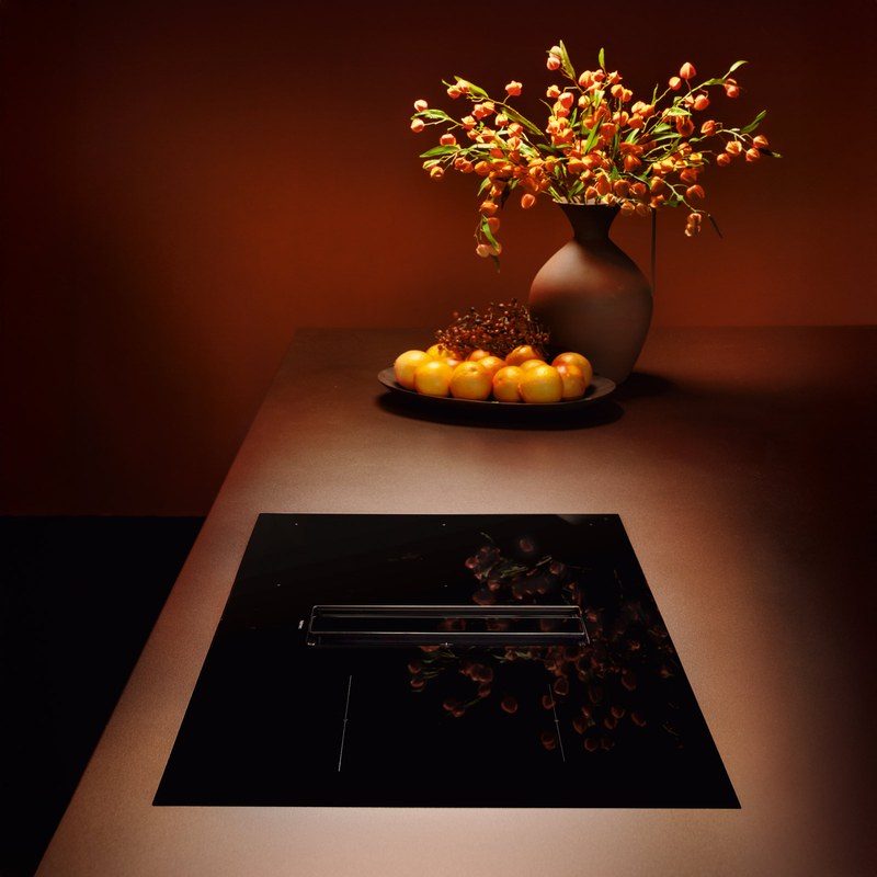 Le système d’aspiration est positionné au centre de la plaque, avec des volets en verre noir motorisés qui s’ouvrent automatiquement en fonctionnement.
