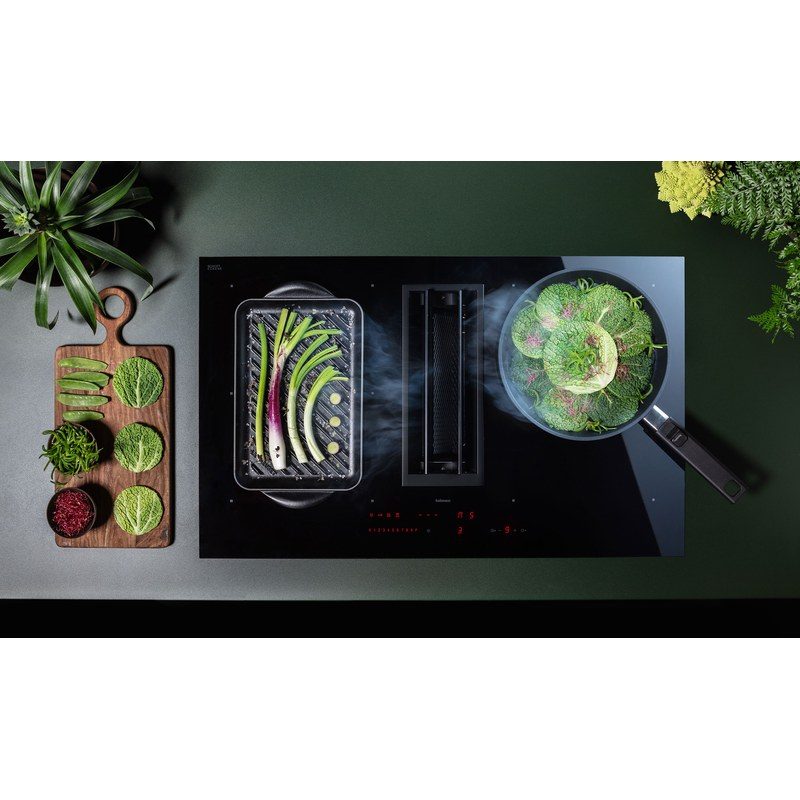 La plaque de cuisson aspirante Falmec Quantum Pro associe une surface en verre-céramique noir brillant à un système d’aspiration intégré, pour une cuisine épurée et fonctionnelle.