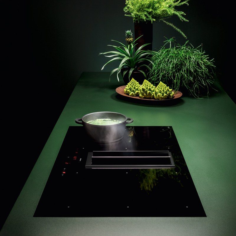 Le système d’aspiration est positionné au centre de la plaque et équipé de volets en verre noir motorisés qui s’ouvrent automatiquement en fonctionnement.