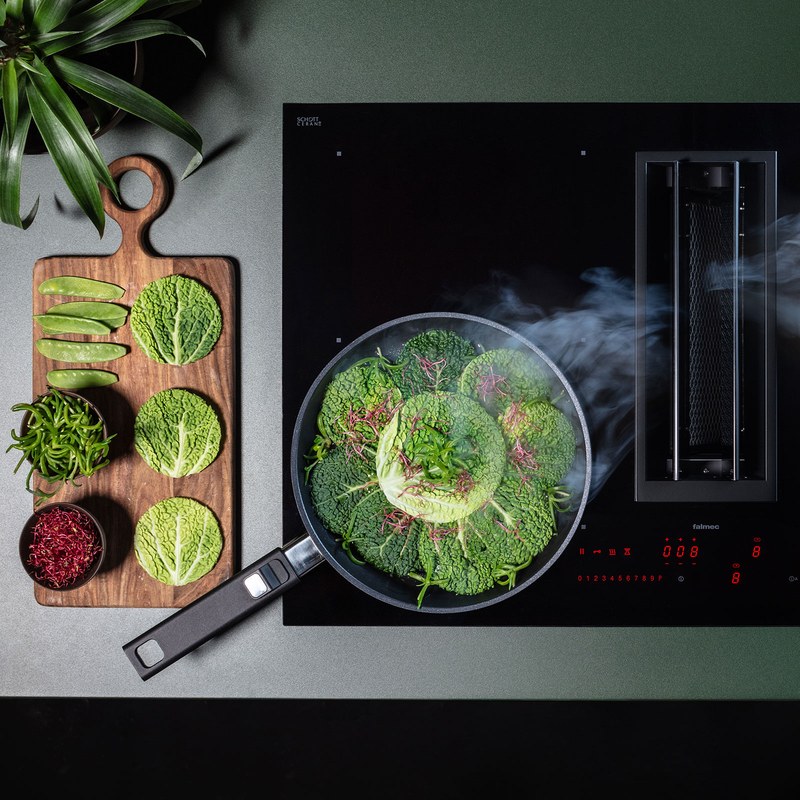 La plaque de cuisson aspirante Falmec Quantum Pro Easy associe une surface en verre-céramique noir brillant à un système d’aspiration intégré, pour une cuisine à l’esthétique épurée et moderne.