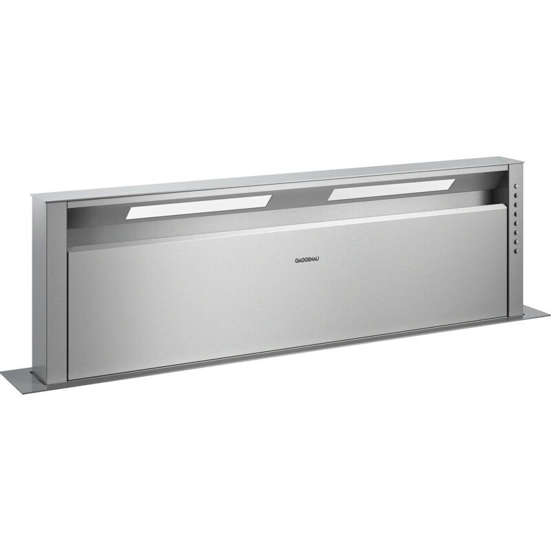 La Gaggenau AL400122 est une hotte de plan de travail télescopique 120 cm conçue pour disparaître entièrement dans le plan de travail lorsqu’elle est à l’arrêt.