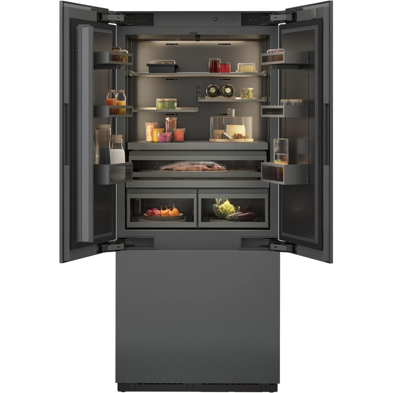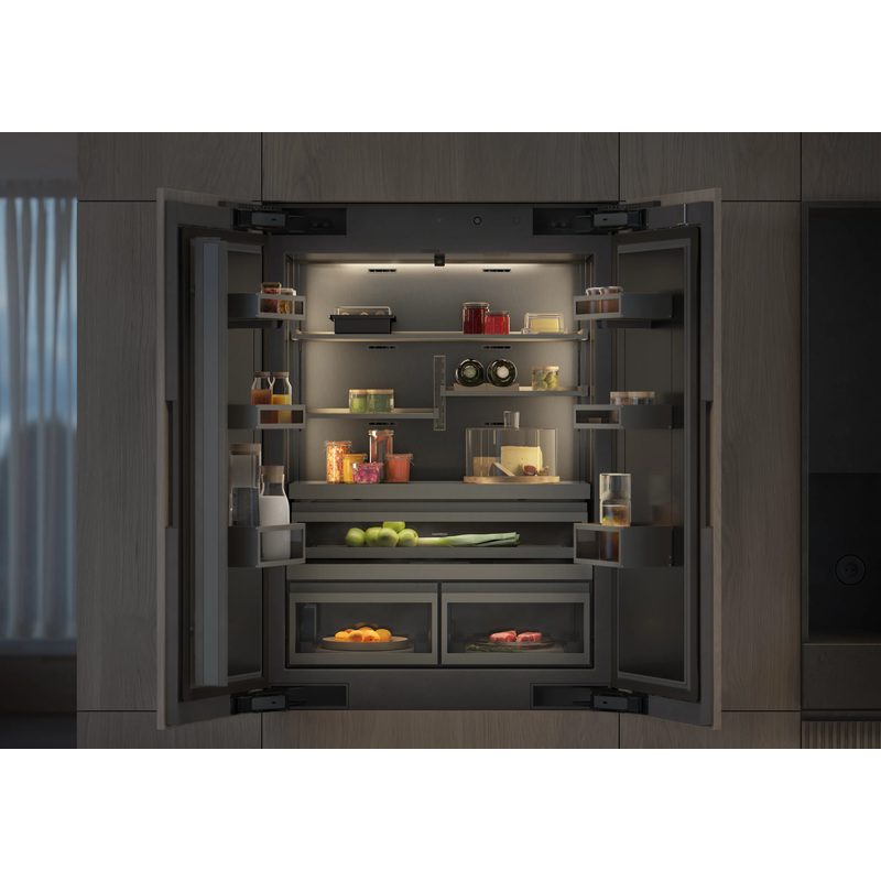 5 zones climatiques, tiroirs fraîcheur proche 0 °C, fabrique à glaçons intégrée avec raccordement à l’eau.