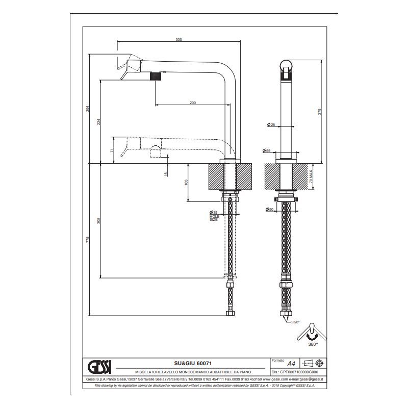 Mitigeur d’évier premium GESSI SU & GIÙ 60071 à bec rabattable, idéal pour installation sous fenêtre, commande monocommande frontale, bec en L pivotant 360°, cartouche mécanique 25 mm, flexibles inclus et finition Finox brossé haut de gamme.