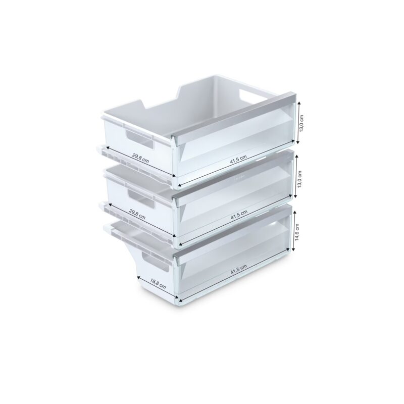 Les trois tiroirs de congélation peuvent être retirés pour agrandir l’espace intérieur grâce au système VarioRoom. Cette modularité permet de stocker facilement des pièces volumineuses ou des emballages de grande taille.