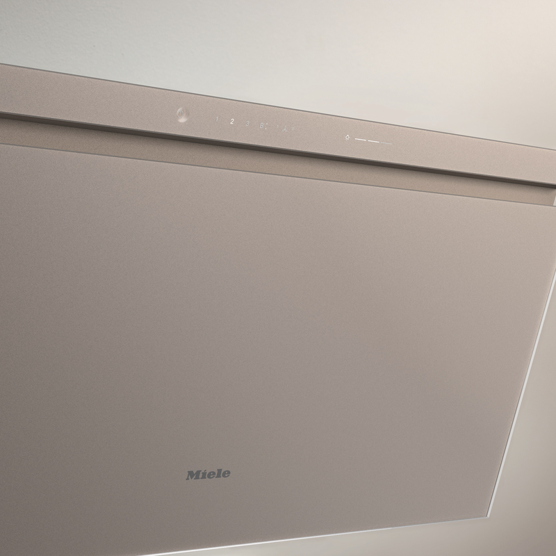 Hotte murale Miele DAH 4980 Sienna, largeur 90 cm, design à hauteur de tête avec panneau en verre Pearlbeige, moteur EcoMotor ultra silencieux, 3 vitesses + 2 Booster, débit jusqu’à 875 m³/h, mise en réseau Con@ctivity et Miele@home, filtres inox 10 couches, classe énergétique A++.