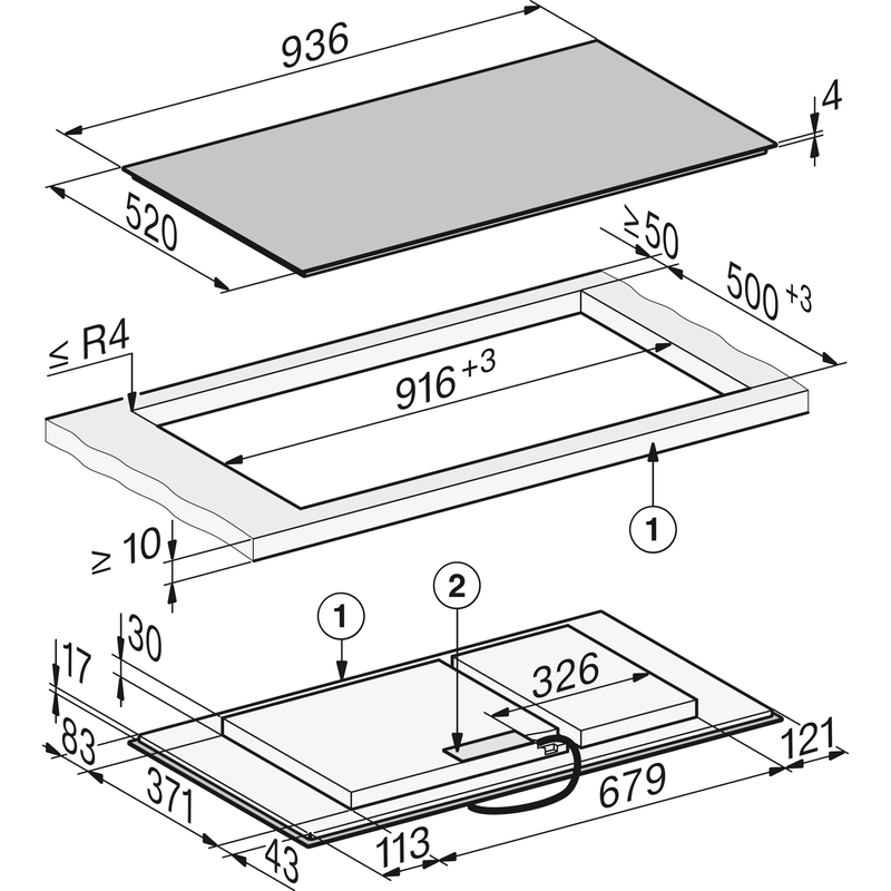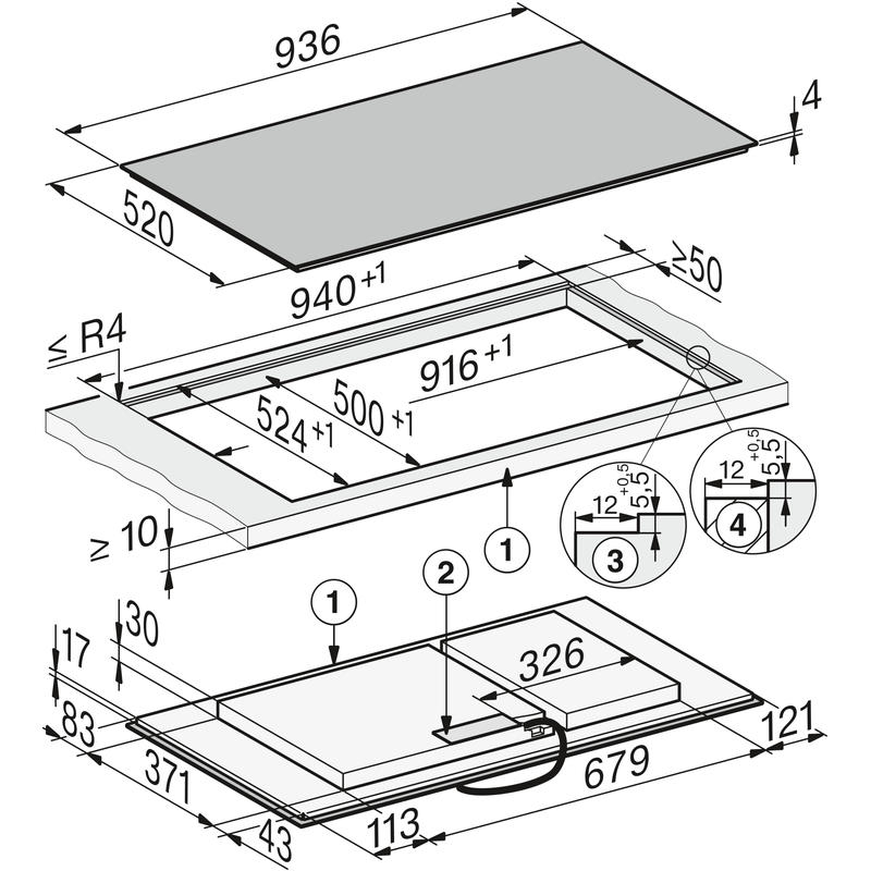 Avec des dimensions de 936 x 520 mm, cette table s’intègre dans une découpe standard de 916 x 500 mm ou en pose à fleur de plan pour une finition premium parfaitement intégrée.