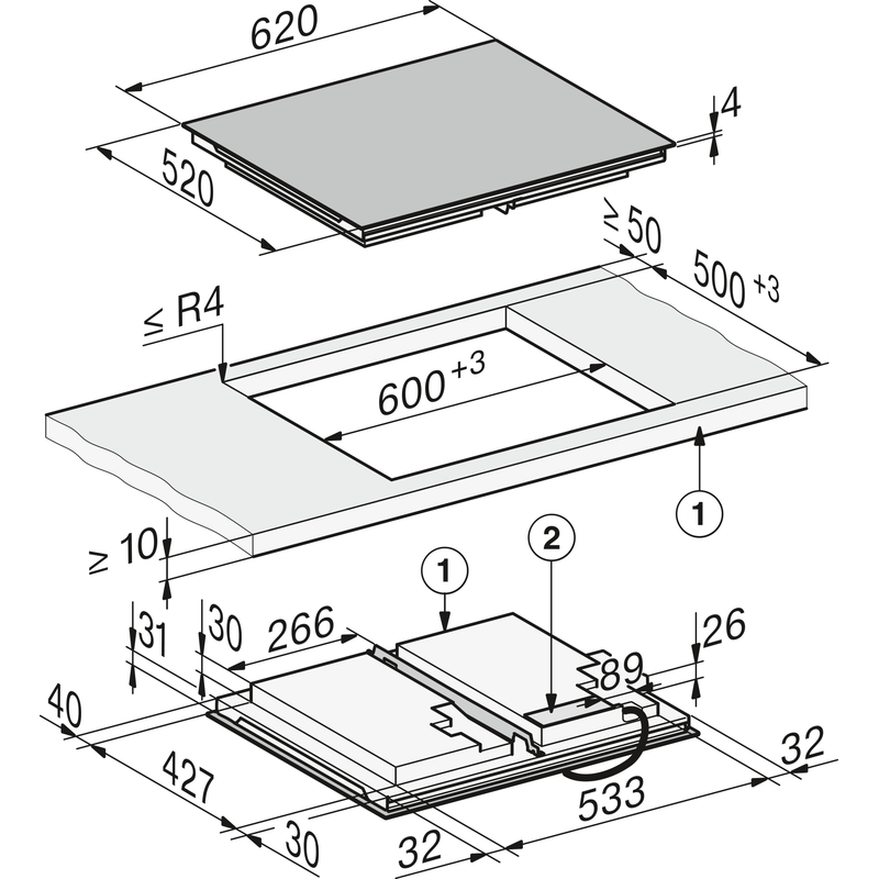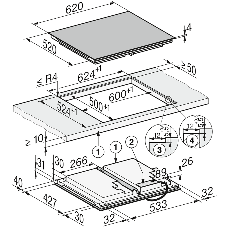 Avec des dimensions de 620 x 520 mm, cette table s’intègre en pose à fleur de plan ou standard avec une découpe de 600 x 500 mm pour une intégration parfaite.