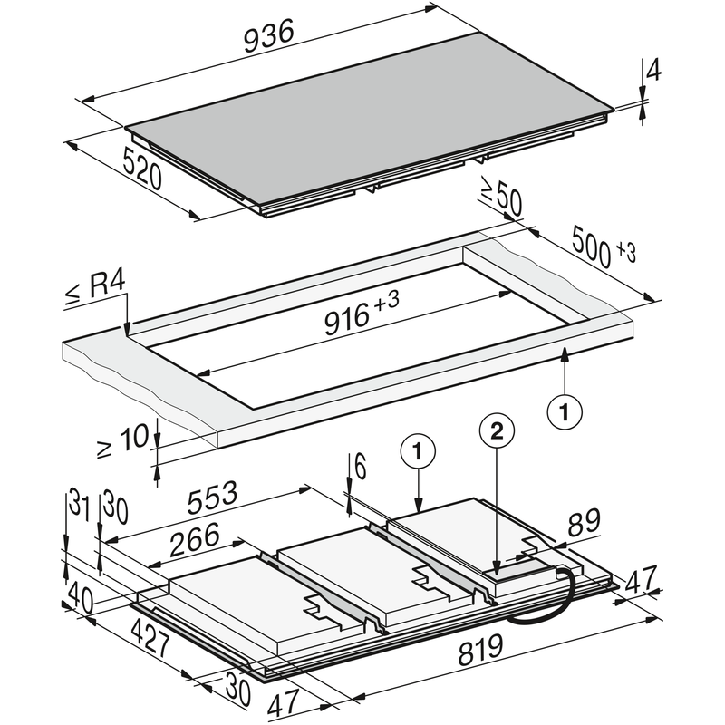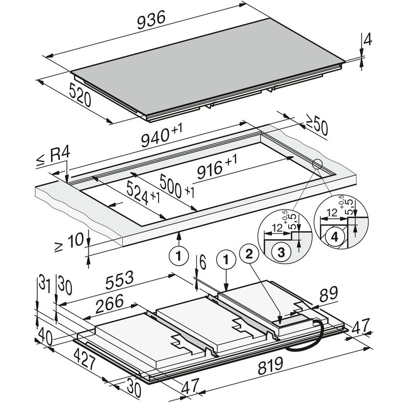 Avec des dimensions de 936 x 520 mm, cette table s’intègre en pose à fleur de plan ou standard avec une découpe de 916 x 500 mm, pour une finition parfaitement intégrée.