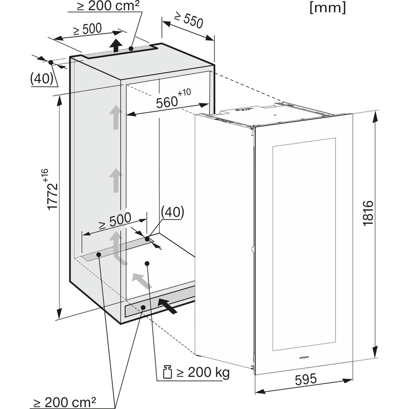 Dimensions de niche : largeur 560 à 570 mm, hauteur 1772 à 1780 mm, profondeur 550 mm