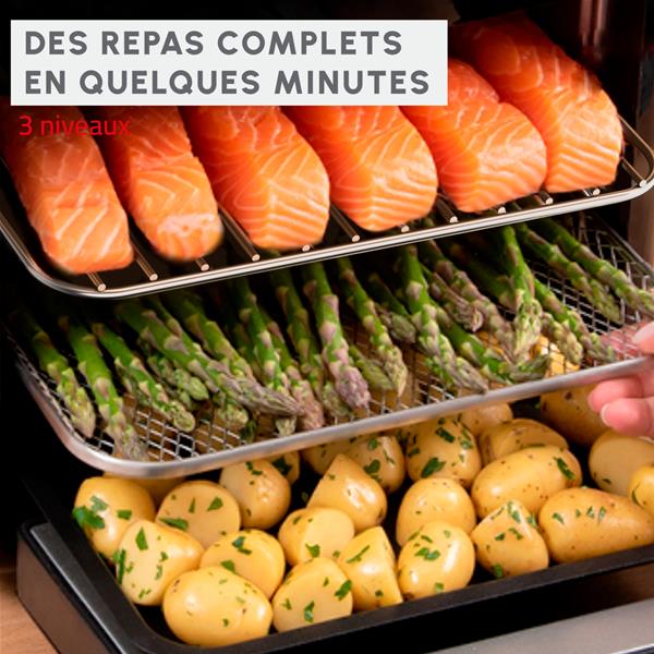 La technologie Extra-Crisp associée à un double système de chauffe (haut et bas) garantit une cuisson homogène et des aliments croustillants avec très peu d’huile. Cette technologie permet de cuisiner des plats savoureux tout en conservant une texture dorée et croustillante.
