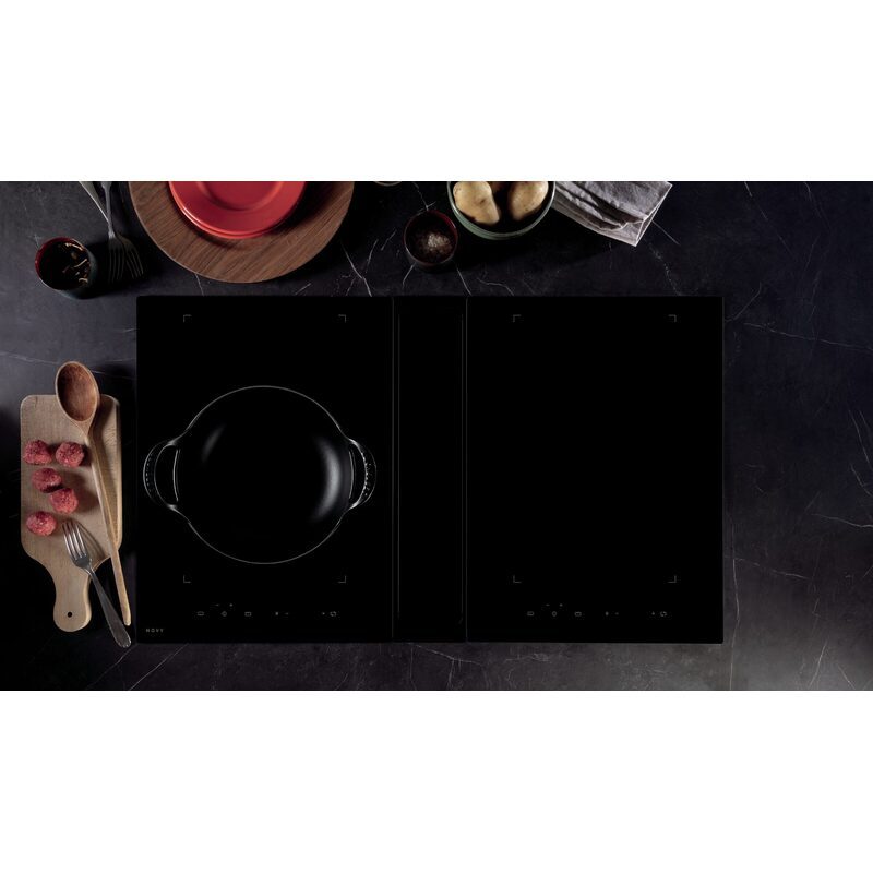 La commande tactile assure un réglage précis sur 9 niveaux de puissance, complétés par une fonction Power. Minuterie sur chaque zone, témoin de chaleur résiduelle et verrouillage du bandeau complètent l’usage au quotidien.