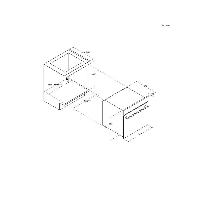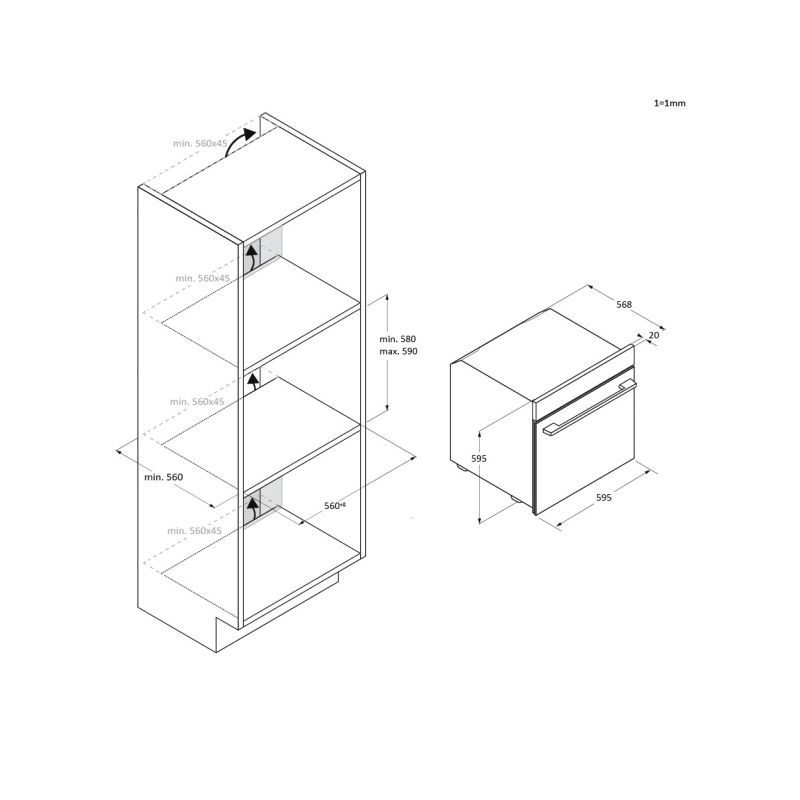 Ce four s’installe dans une niche standard avec des dimensions d’encastrement de 59 x 56 x 56 cm.
