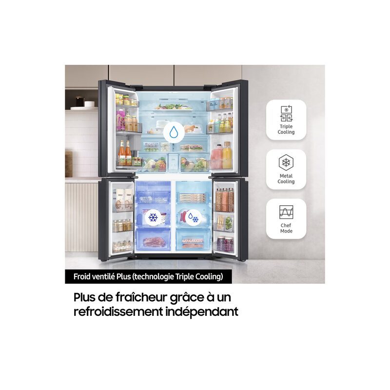 La technologie Triple Cooling™ assure un refroidissement indépendant pour chaque compartiment grâce à des évaporateurs séparés. Elle maintient une température stable et une humidité optimale, évitant le mélange des odeurs et garantissant une meilleure conservation des aliments.