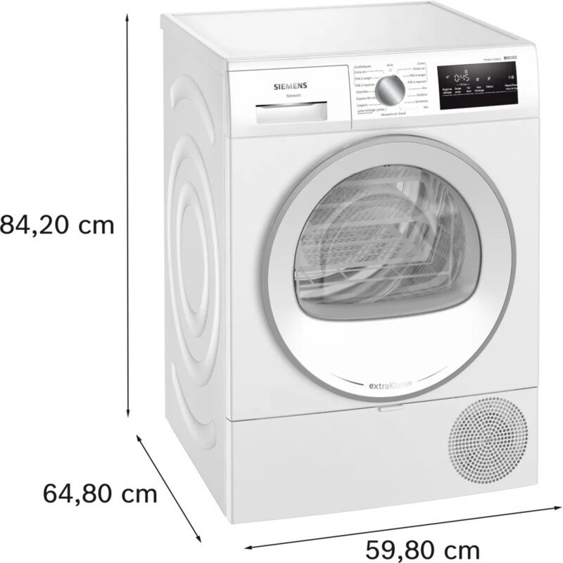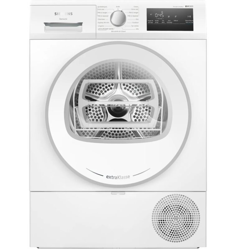 Sèche-linge pompe à chaleur Siemens ExtraKlasse WT45H00MFR, capacité 8 kg, technologie autoDry, filtre easyClean, programmes rapides et délicats, conception premium avec garantie 3 ans.