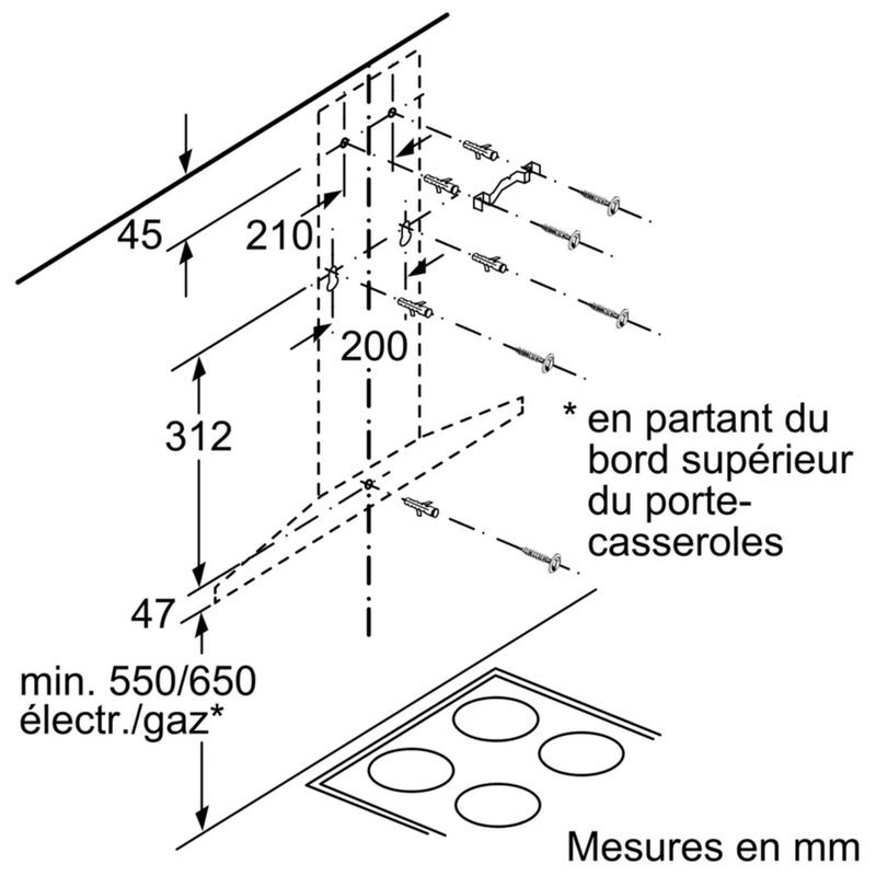 Distances minimales : 550 mm au-dessus électrique, 650 mm au-dessus gaz (schémas page 3).