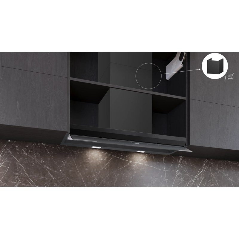 Hotte Siemens intégrée 90 cm avec moteur iQdrive silencieux et puissance d’aspiration jusqu’à 699 m³/h en mode intensif.