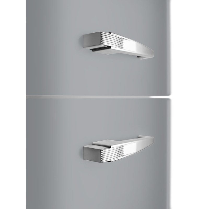 Finition Gris métal brillante, design bombé et poignée externe chromée incarnent l’esthétique iconique Années 50.