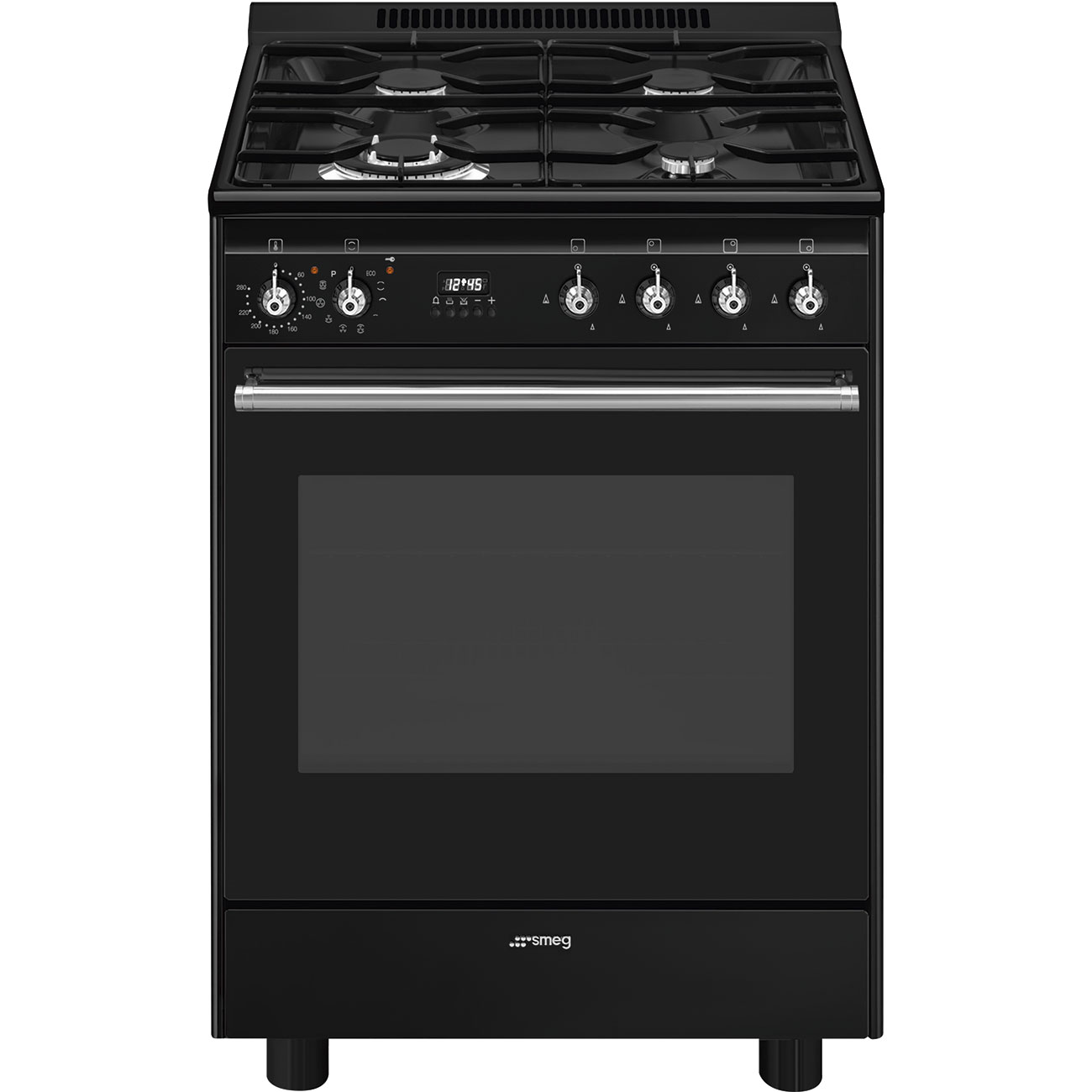 Piano de cuisson 60 cm avec table gaz 4 foyers, four chaleur tournante 70 L, nettoyage pyrolyse, esthétique Classica noire et commandes Smeg inox. Performance, précision et design.