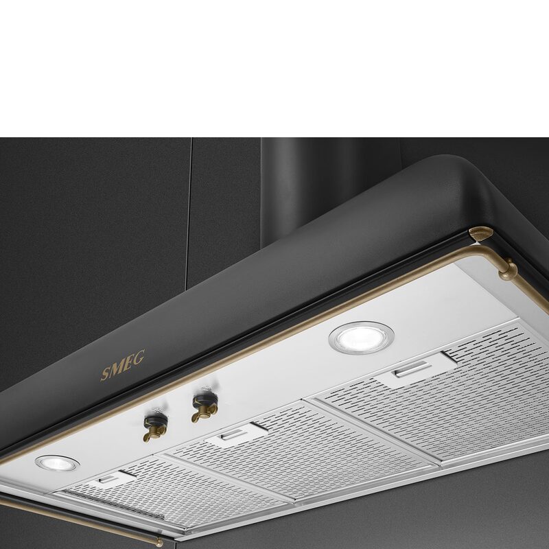 La Smeg KS89AOE est une hotte décorative murale de 90 cm au design Coloniale. Sa finition anthracite associée à des manettes en laiton antique apporte un caractère chaleureux et authentique à la cuisine, tout en conservant une performance d’aspiration élevée.