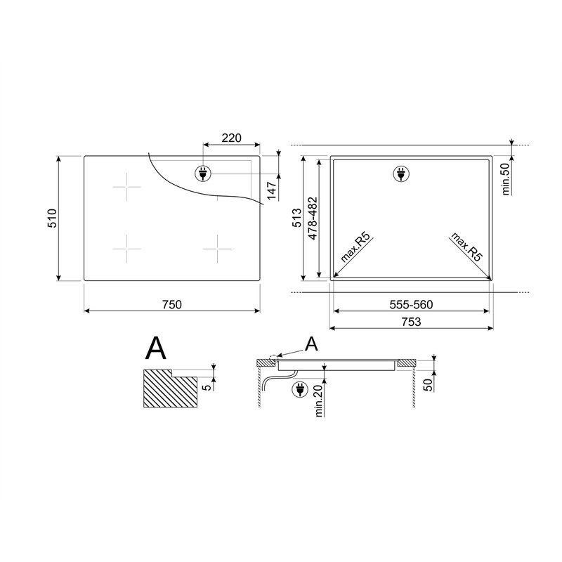 Dimensions : 75 cm. Encastrement : 478-482 x 555-560 mm.