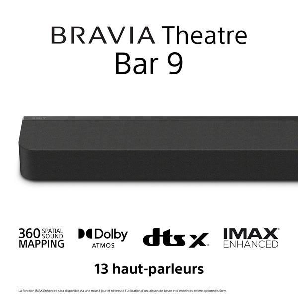 Barre de son Sony BRAVIA Theatre Bar 9 avec Dolby Atmos, DTS:X et technologie 360 Spatial Sound Mapping. Conçue pour les TV BRAVIA, avec Acoustic Center Sync, Voice Zoom 3 et compatibilité HDMI 2.1 pour une expérience cinéma immersive.
