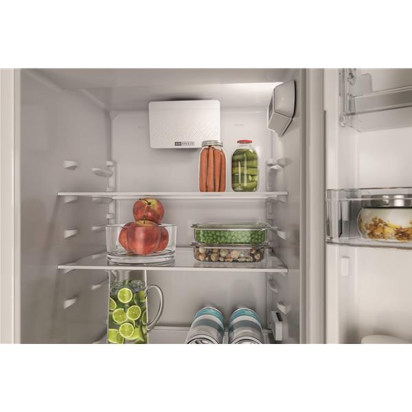 Le réfrigérateur dispose de clayettes en verre ajustables, de porte-bouteilles en métal et d’un bac à légumes avec contrôle d’humidité. L’éclairage LED garantit une excellente visibilité.